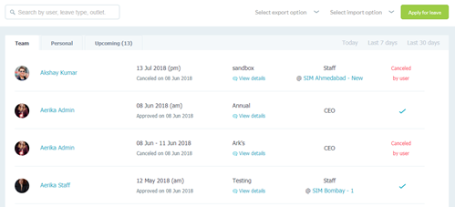 Centered around people, you will notice that this page is built around a listing of relevant staff. These make up a core component and here (because clarity is one of the driving factors of the update) you can view data for today, the last 7 days and the last 30 days. The focus of this page draws users clearly towards whether or not a particular person's leave has been approved. Important dates such as dates of approval or cancellation can also be clearly seen as well as member designations.