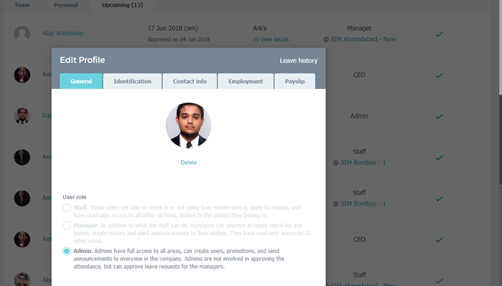 Profiles can be viewed and edited easily and display everything from General info such as User roles to Payslip...etc. You can also deal with individual leave management within a user profile and manage leave history visibility of each leave type.