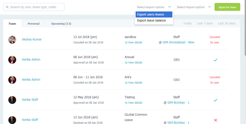 Aside from these, you can also find the big, green Apply for leave button as well as options to import and export your data. You can export/import your data by user's leaves or leave balance.