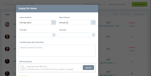 When you click on the prominent Apply for leave button, you will be able to apply for leave by selecting a leave duration (Full day leave...etc) from a dropdown, Type of leave from a dropdown and filling in other relevant data. You can also attach files/documents to the application and add comments to leave applications. Hourly based leave can now be applied for in your new and improved Carbonate system.
